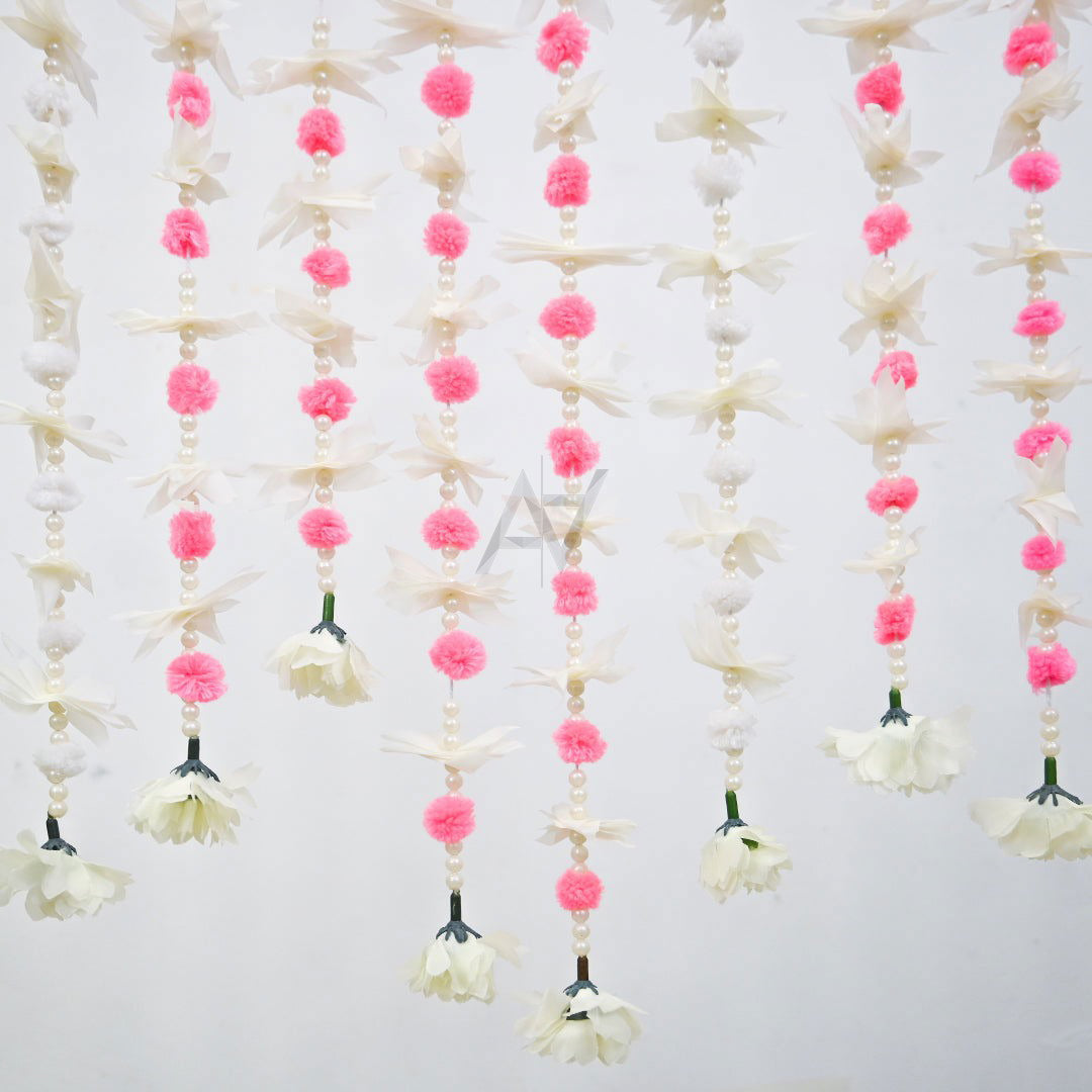 Elevate your wedding decor with 12 small pom pom garlands, perfect for traditional events. Available in 4 colors and 6 feet in length. Durable and versatile, these garlands are ideal for both indoor and outdoor use.